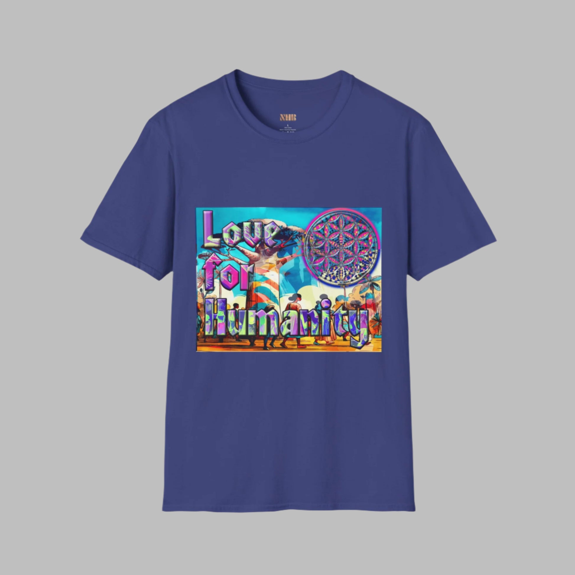 A unisex softstyle t-shirt featuring the print "Love for humanity" with people walking before a huge tree and the flower of life symbol. This t-shirt offers a blend of comfort and style, perfect for those who care about humanity and spirituality. Ideal for casual wear, this tee can be a meaningful addition to your wardrobe, especially for Earth Day, peace rallies, or community events.
