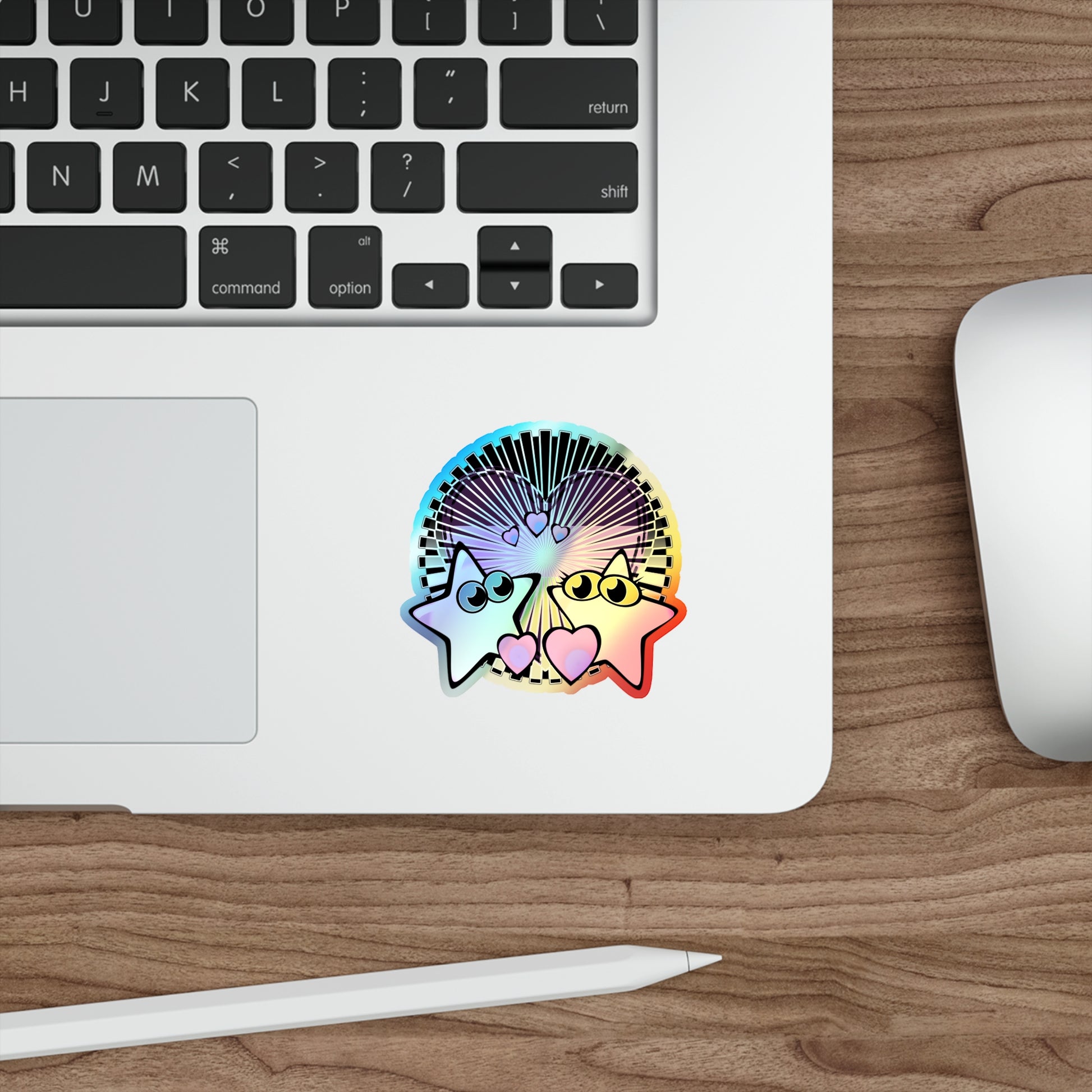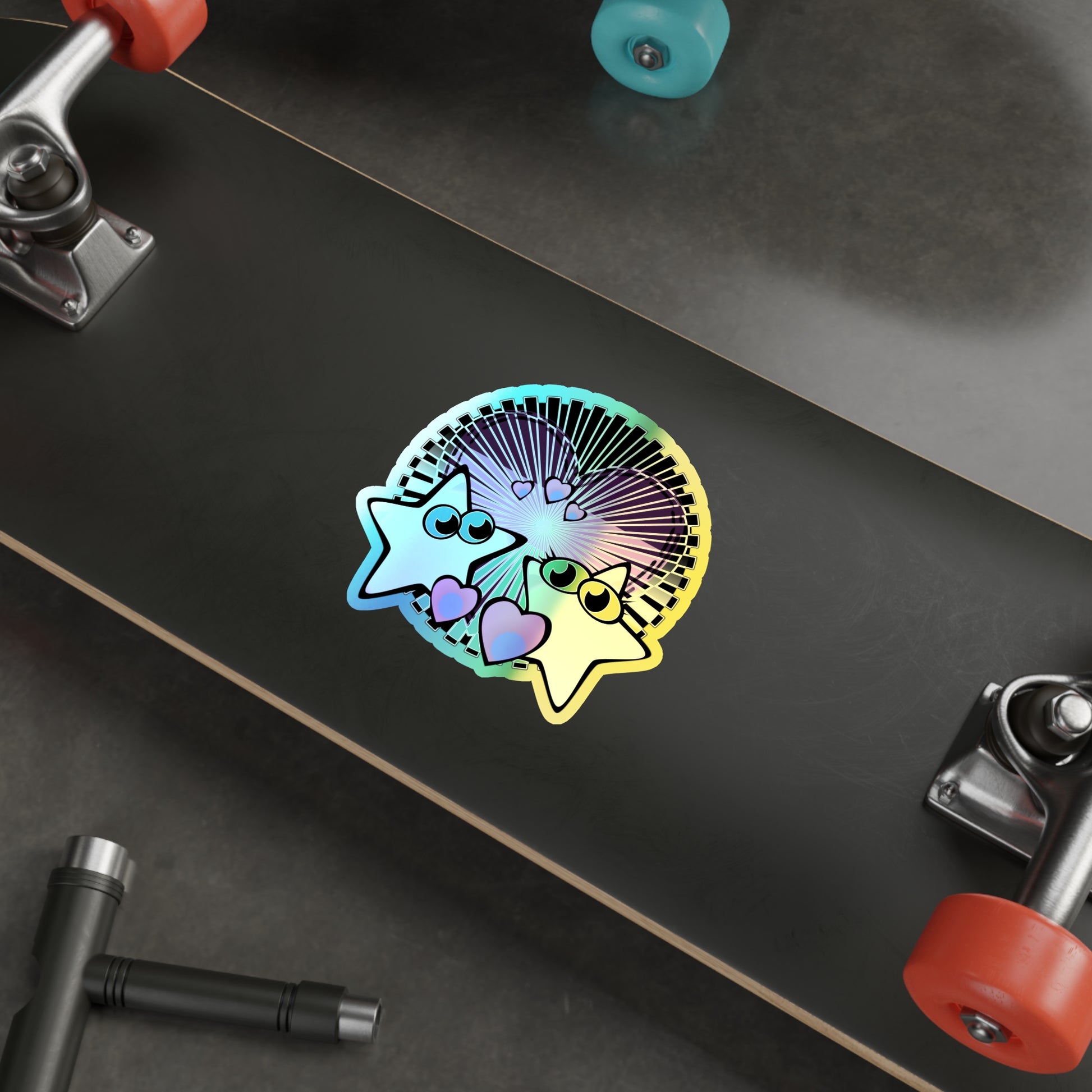 A playful holographic die-cut sticker that brings instant sparkle to sketchbooks, laptops, water bottles, and skate decks. Two wide-eyed stars cuddle in front of a bursting, rainbow-halo backdrop — the holographic finish shifts from cool blues to warm pinks as it catches light. The sticker reads as bold and graphic from a distance, then reveals shimmering color shifts and subtle transparency up close. It’s made for people who love quirky, kawaii-inspired art with a retro-arcade vibe and want a little iridescent personality on everyday gear.