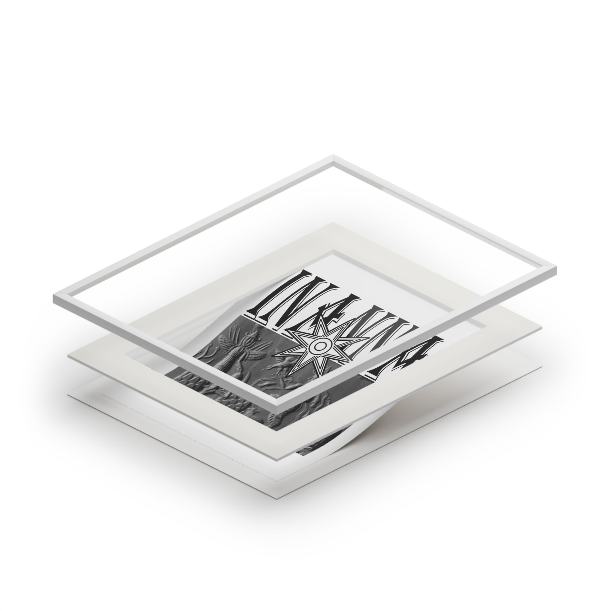 This passepartout-mounted fine art print brings an ancient, tactile energy into modern spaces. The giclée reproduction holds crisp, high-contrast blacks and luminous whites, so the carved-relief imagery and bold lettering keep their depth and presence on the wall. Surrounded by a clean, natural-white 2mm window mount, the artwork reads like a small shrine or study-piece — quiet, reverent, and ready to anchor a gallery wall, a reading nook, or a focused altar of interest. The mountboard arrives separate from the protective front, so you assemble and seat the print into its window for a perfectly aligned, museum-like look.