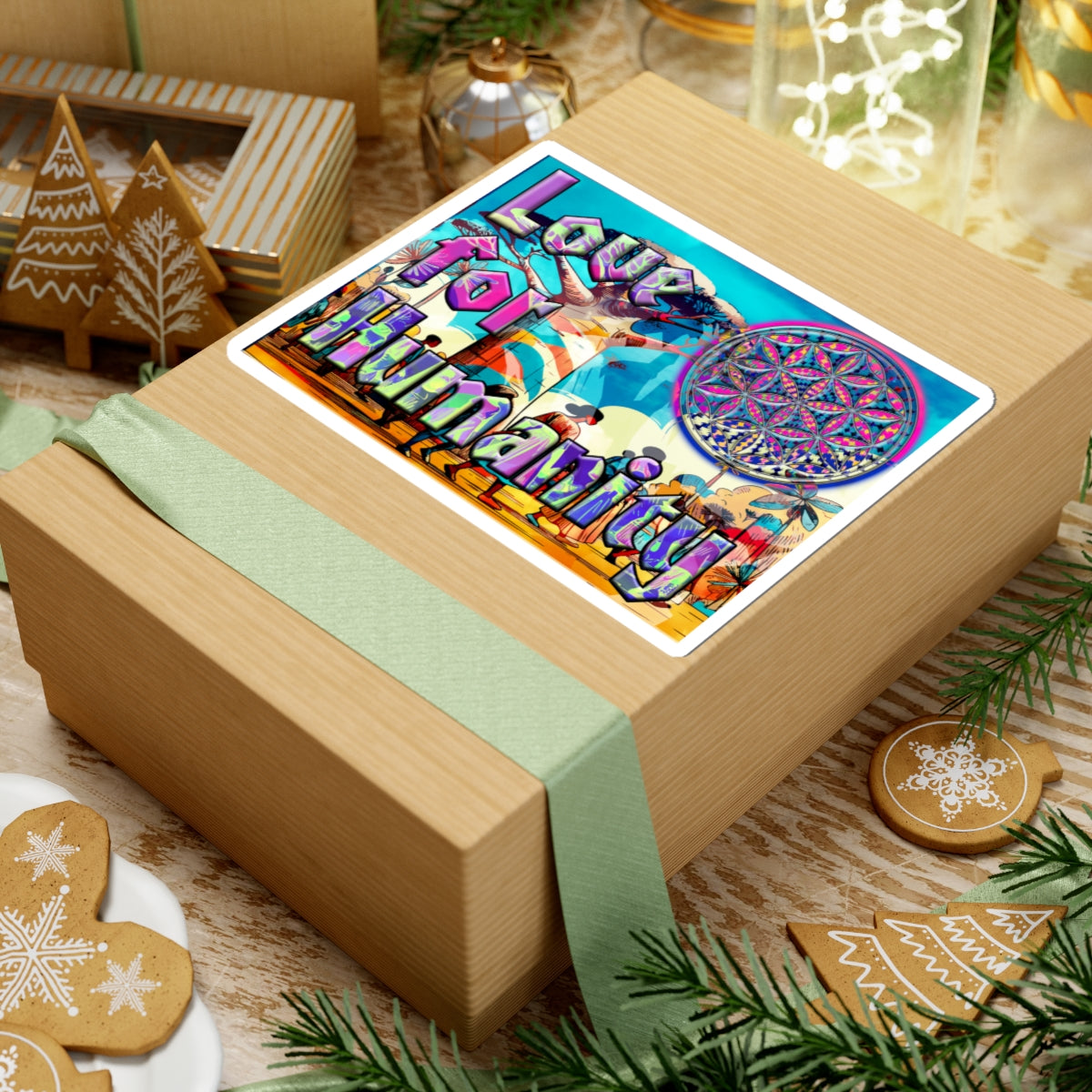 Bright, joyful kiss-cut stickers that celebrate connection and compassion. Vivid, eco-solvent printed colors bring the retro-futuristic “Love for Humanity” artwork to life — layered with a mandala-style motif and sunlit festival scene. These durable vinyl stickers apply smoothly to flat surfaces like laptops, journals, and windows, adding an uplifting, colorful accent to everyday items. Choose white or transparent backing and from multiple sizes to suit your space. The glossy finish keeps the artwork punchy and scratch-resistant so the message stays bold as you go about your day.