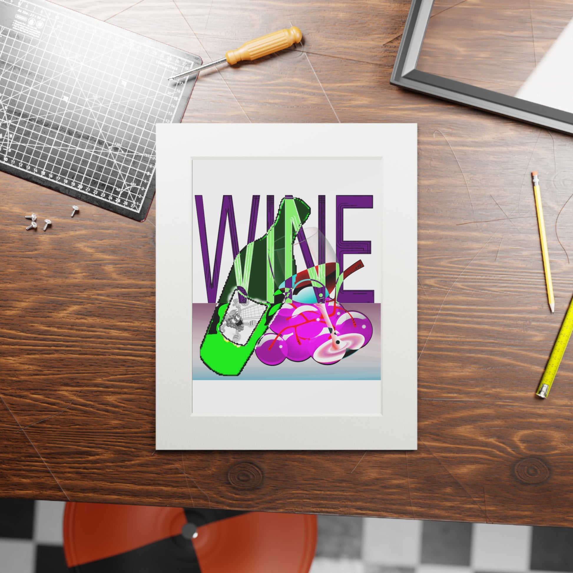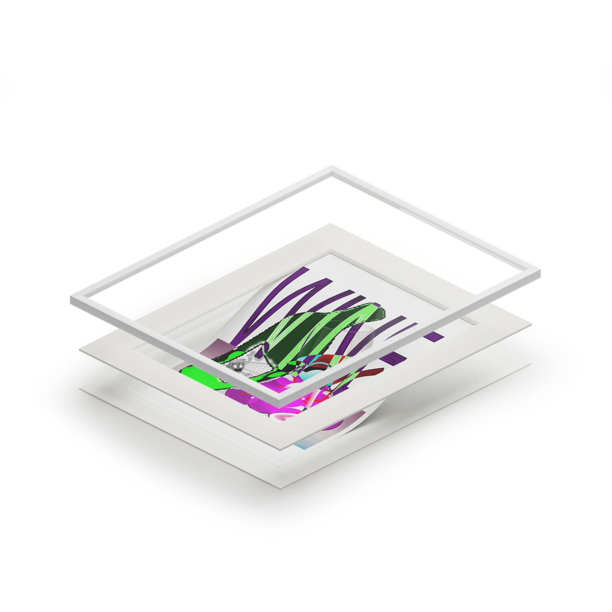 A vivid fine art print presented with a clean, natural-white passepartout that brings bold color and playful composition into any room. The giclée printing process captures saturated purples, greens and pinks with archival stability so the illustration keeps its punch even with regular sunlight. The thick 2mm textured mountboard creates a crisp window that gently distances the artwork from its surroundings, giving it a gallery-like presence on a shelf, mantel, or small wall grouping. Lightweight and ready for you to frame under glass (protective frame not included), the print arrives flat with the mountboard separate for simple assembly—an easy way to add energetic, contemporary art to a kitchen nook, studio corner, or apartment living space.